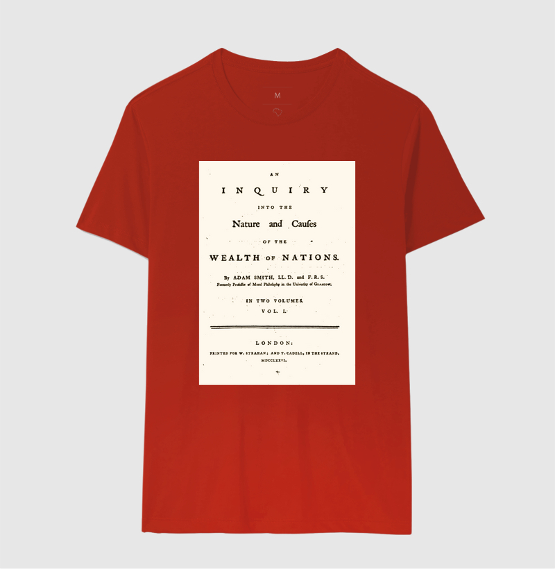 A camiseta "A Riqueza das Nações, 1776" celebra um dos livros mais influentes da história da economia. Escrito por Adam Smith, essa obra lançou as bases do liberalismo econômico e do conceito de livre mercado. A estampa traz a página de título original do livro, publicada em 1776, um verdadeiro marco na compreensão do capitalismo e das dinâmicas de produção e comércio. Ideal para economistas, estudantes e entusiastas da história do pensamento econômico.