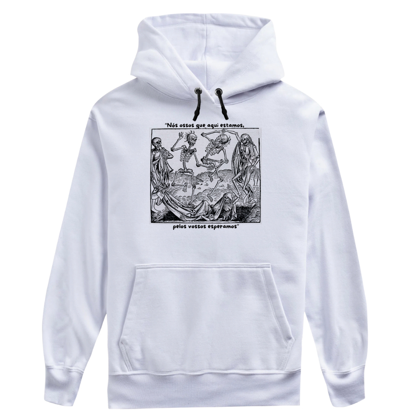 MOLETOM MEMENTO MORI II. Com "Memento Mori II", você veste um pedaço de história e um lembrete atemporal. Inspirada na iconografia medieval da "Dança Macabra", esta camiseta apresenta uma estampa evocativa que convida à meditação sobre a mortalidade. A frase "Nós ossos que aqui estamos, pelos vossos esperamos" reforça o caráter contemplativo da peça. Confeccionada em algodão suave, proporciona conforto e durabilidade, perfeita para quem busca unir estilo e significado. Use "Memento Mori II" e celebre a arte e a filosofia que nos conectam ao passado.