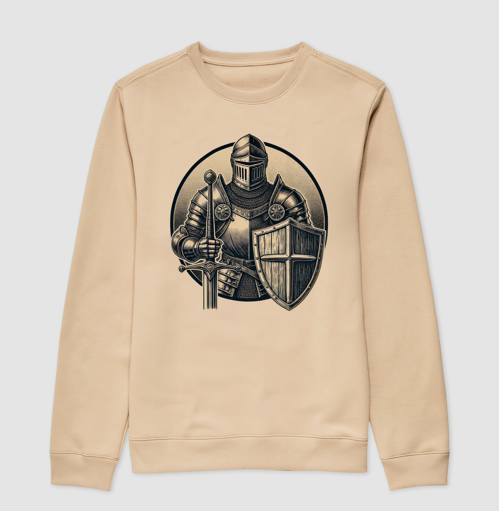 SUÉTER MOLETOM BRAVURA E HONRA. Celebre a coragem e a nobreza dos cavaleiros medievais com a camiseta "Bravura e Honra". Feita em algodão macio e resistente, esta camiseta proporciona um toque de conforto e estilo clássico. A estampa vibrante mostra um cavaleiro medieval com sua espada e escudo, destacando os valores de bravura e honra que definem a cavalaria. Ideal para entusiastas da história e admiradores da cultura medieval, esta camiseta é uma homenagem ao espírito indomável dos antigos guerreiros. Vista "Bravura e Honra" e carregue consigo a essência dos tempos medievais.